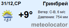 Представляем прогноз погоды в Гринбрее на 3 дня (сегодня, завтра и послезавтра). Подробнее...Щелкните на соответствующем дне, чтобы получить подробный прогноз по нему. Для просмотра расширенных данных щелкните по заголовку соответствующего блока из группы блоков, расплолженных ниже основного прогноза. Для получения данных на другие дни используйте стрелки слева и справа от таблицы или навигационное меню в левой колонке страницы. Свернуть