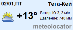 Представляем прогноз погоды в Тега-Кей на 3 дня (сегодня, завтра и послезавтра). Подробнее...Щелкните на соответствующем дне, чтобы получить подробный прогноз по нему. Для просмотра расширенных данных щелкните по заголовку соответствующего блока из группы блоков, расплолженных ниже основного прогноза. Для получения данных на другие дни используйте стрелки слева и справа от таблицы или навигационное меню в левой колонке страницы. Свернуть