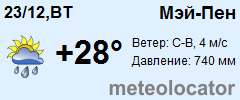 Представляем прогноз погоды в Мэй-Пене на 3 дня (сегодня, завтра и послезавтра). Подробнее...Щелкните на соответствующем дне, чтобы получить подробный прогноз по нему. Для просмотра расширенных данных щелкните по заголовку соответствующего блока из группы блоков, расплолженных ниже основного прогноза. Для получения данных на другие дни используйте стрелки слева и справа от таблицы или навигационное меню в левой колонке страницы. Свернуть
