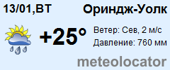 Представляем прогноз погоды в Ориндж-Уолке на 3 дня (сегодня, завтра и послезавтра). Подробнее...Щелкните на соответствующем дне, чтобы получить подробный прогноз по нему. Для просмотра расширенных данных щелкните по заголовку соответствующего блока из группы блоков, расплолженных ниже основного прогноза. Для получения данных на другие дни используйте стрелки слева и справа от таблицы или навигационное меню в левой колонке страницы. Свернуть