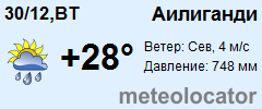 Представляем прогноз погоды в Аилиганди на 3 дня (сегодня, завтра и послезавтра). Подробнее...Щелкните на соответствующем дне, чтобы получить подробный прогноз по нему. Для просмотра расширенных данных щелкните по заголовку соответствующего блока из группы блоков, расплолженных ниже основного прогноза. Для получения данных на другие дни используйте стрелки слева и справа от таблицы или навигационное меню в левой колонке страницы. Свернуть