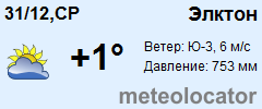 Представляем прогноз погоды в Элктоне на 3 дня (сегодня, завтра и послезавтра). Подробнее...Щелкните на соответствующем дне, чтобы получить подробный прогноз по нему. Для просмотра расширенных данных щелкните по заголовку соответствующего блока из группы блоков, расплолженных ниже основного прогноза. Для получения данных на другие дни используйте стрелки слева и справа от таблицы или навигационное меню в левой колонке страницы. Свернуть