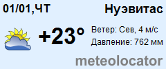 Представляем прогноз погоды в Нуэвитасе на 3 дня (сегодня, завтра и послезавтра). Подробнее...Щелкните на соответствующем дне, чтобы получить подробный прогноз по нему. Для просмотра расширенных данных щелкните по заголовку соответствующего блока из группы блоков, расплолженных ниже основного прогноза. Для получения данных на другие дни используйте стрелки слева и справа от таблицы или навигационное меню в левой колонке страницы. Свернуть