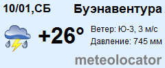 Представляем прогноз погоды в Буэнавентуре на 3 дня (сегодня, завтра и послезавтра). Подробнее...Щелкните на соответствующем дне, чтобы получить подробный прогноз по нему. Для просмотра расширенных данных щелкните по заголовку соответствующего блока из группы блоков, расплолженных ниже основного прогноза. Для получения данных на другие дни используйте стрелки слева и справа от таблицы или навигационное меню в левой колонке страницы. Свернуть
