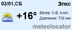 Представляем прогноз погоды в Элксе на 3 дня (сегодня, завтра и послезавтра). Подробнее...Щелкните на соответствующем дне, чтобы получить подробный прогноз по нему. Для просмотра расширенных данных щелкните по заголовку соответствующего блока из группы блоков, расплолженных ниже основного прогноза. Для получения данных на другие дни используйте стрелки слева и справа от таблицы или навигационное меню в левой колонке страницы. Свернуть