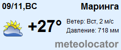 Представляем прогноз погоды в Маринге на 3 дня (сегодня, завтра и послезавтра). Подробнее...Щелкните на соответствующем дне, чтобы получить подробный прогноз по нему. Для просмотра расширенных данных щелкните по заголовку соответствующего блока из группы блоков, расплолженных ниже основного прогноза. Для получения данных на другие дни используйте стрелки слева и справа от таблицы или навигационное меню в левой колонке страницы. Свернуть