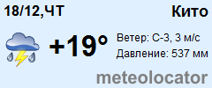 Ниже представлен прогноз погоды в Кито на 7 - 9 дней. Подробнее...Щелкните на соответствующем дне, чтобы получить подробный прогноз по нему. Для просмотра расширенных данных щелкните по заголовку соответствующего блока из группы блоков, расплолженных ниже основного прогноза. Для получения информации на другие дни используйте стрелки слева и справа от таблицы с погодой или навигационное меню в левой колонке страницы. Свернуть