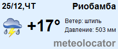 Представляем прогноз погоды в Риобамбе на 3 дня (сегодня, завтра и послезавтра). Подробнее...Щелкните на соответствующем дне, чтобы получить подробный прогноз по нему. Для просмотра расширенных данных щелкните по заголовку соответствующего блока из группы блоков, расплолженных ниже основного прогноза. Для получения данных на другие дни используйте стрелки слева и справа от таблицы или навигационное меню в левой колонке страницы. Свернуть