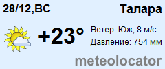 Представляем прогноз погоды в Таларе на 3 дня (сегодня, завтра и послезавтра). Подробнее...Щелкните на соответствующем дне, чтобы получить подробный прогноз по нему. Для просмотра расширенных данных щелкните по заголовку соответствующего блока из группы блоков, расплолженных ниже основного прогноза. Для получения данных на другие дни используйте стрелки слева и справа от таблицы или навигационное меню в левой колонке страницы. Свернуть