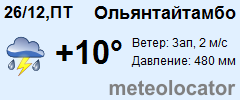 Представляем прогноз погоды в Ольянтайтамбо на 3 дня (сегодня, завтра и послезавтра). Подробнее...Щелкните на соответствующем дне, чтобы получить подробный прогноз по нему. Для просмотра расширенных данных щелкните по заголовку соответствующего блока из группы блоков, расплолженных ниже основного прогноза. Для получения данных на другие дни используйте стрелки слева и справа от таблицы или навигационное меню в левой колонке страницы. Свернуть
