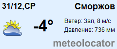 Представляем прогноз погоды в Сморжове на 3 дня (сегодня, завтра и послезавтра). Подробнее...Щелкните на соответствующем дне, чтобы получить подробный прогноз по нему. Для просмотра расширенных данных щелкните по заголовку соответствующего блока из группы блоков, расплолженных ниже основного прогноза. Для получения данных на другие дни используйте стрелки слева и справа от таблицы или навигационное меню в левой колонке страницы. Свернуть