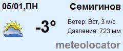 Представляем прогноз погоды в Семигинове на 3 дня (сегодня, завтра и послезавтра). Подробнее...Щелкните на соответствующем дне, чтобы получить подробный прогноз по нему. Для просмотра расширенных данных щелкните по заголовку соответствующего блока из группы блоков, расплолженных ниже основного прогноза. Для получения данных на другие дни используйте стрелки слева и справа от таблицы или навигационное меню в левой колонке страницы. Свернуть