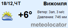 Представляем прогноз погоды в Вижомле на 3 дня (сегодня, завтра и послезавтра). Подробнее...Щелкните на соответствующем дне, чтобы получить подробный прогноз по нему. Для просмотра расширенных данных щелкните по заголовку соответствующего блока из группы блоков, расплолженных ниже основного прогноза. Для получения данных на другие дни используйте стрелки слева и справа от таблицы или навигационное меню в левой колонке страницы. Свернуть