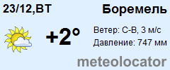 Представляем прогноз погоды в Боремеле на 3 дня (сегодня, завтра и послезавтра). Подробнее...Щелкните на соответствующем дне, чтобы получить подробный прогноз по нему. Для просмотра расширенных данных щелкните по заголовку соответствующего блока из группы блоков, расплолженных ниже основного прогноза. Для получения данных на другие дни используйте стрелки слева и справа от таблицы или навигационное меню в левой колонке страницы. Свернуть