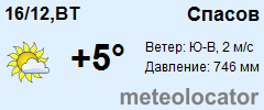 Представляем прогноз погоды в Спасове на 3 дня (сегодня, завтра и послезавтра). Подробнее...Щелкните на соответствующем дне, чтобы получить подробный прогноз по нему. Для просмотра расширенных данных щелкните по заголовку соответствующего блока из группы блоков, расплолженных ниже основного прогноза. Для получения данных на другие дни используйте стрелки слева и справа от таблицы или навигационное меню в левой колонке страницы. Свернуть