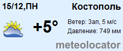 Представляем прогноз погоды в Костополе на 3 дня (сегодня, завтра и послезавтра). Подробнее...Щелкните на соответствующем дне, чтобы получить подробный прогноз по нему. Для просмотра расширенных данных щелкните по заголовку соответствующего блока из группы блоков, расплолженных ниже основного прогноза. Для получения данных на другие дни используйте стрелки слева и справа от таблицы или навигационное меню в левой колонке страницы. Свернуть