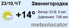 Представляем прогноз погоды в Звенигородке на 3 дня (сегодня, завтра и послезавтра). Подробнее...Щелкните на соответствующем дне, чтобы получить подробный прогноз по нему. Для просмотра расширенных данных щелкните по заголовку соответствующего блока из группы блоков, расплолженных ниже основного прогноза. Для получения данных на другие дни используйте стрелки слева и справа от таблицы или навигационное меню в левой колонке страницы. Свернуть