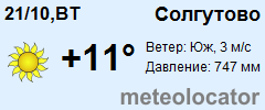 Представляем прогноз погоды в Солгутово на 3 дня (сегодня, завтра и послезавтра). Подробнее...Щелкните на соответствующем дне, чтобы получить подробный прогноз по нему. Для просмотра расширенных данных щелкните по заголовку соответствующего блока из группы блоков, расплолженных ниже основного прогноза. Для получения данных на другие дни используйте стрелки слева и справа от таблицы или навигационное меню в левой колонке страницы. Свернуть