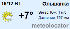Представляем прогноз погоды в Ольшанке на 3 дня (сегодня, завтра и послезавтра). Подробнее...Щелкните на соответствующем дне, чтобы получить подробный прогноз по нему. Для просмотра расширенных данных щелкните по заголовку соответствующего блока из группы блоков, расплолженных ниже основного прогноза. Для получения данных на другие дни используйте стрелки слева и справа от таблицы или навигационное меню в левой колонке страницы. Свернуть
