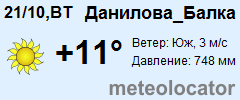 Представляем прогноз погоды в Даниловой Балке на 3 дня (сегодня, завтра и послезавтра). Подробнее...Щелкните на соответствующем дне, чтобы получить подробный прогноз по нему. Для просмотра расширенных данных щелкните по заголовку соответствующего блока из группы блоков, расплолженных ниже основного прогноза. Для получения данных на другие дни используйте стрелки слева и справа от таблицы или навигационное меню в левой колонке страницы. Свернуть