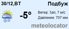 Представляем прогноз погоды в Подбуже на 3 дня (сегодня, завтра и послезавтра). Подробнее...Щелкните на соответствующем дне, чтобы получить подробный прогноз по нему. Для просмотра расширенных данных щелкните по заголовку соответствующего блока из группы блоков, расплолженных ниже основного прогноза. Для получения данных на другие дни используйте стрелки слева и справа от таблицы или навигационное меню в левой колонке страницы. Свернуть