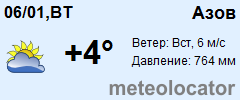 Представляем прогноз погоды в Азове на 3 дня (сегодня, завтра и послезавтра). Подробнее...Щелкните на соответствующем дне, чтобы получить подробный прогноз по нему. Для просмотра расширенных данных щелкните по заголовку соответствующего блока из группы блоков, расплолженных ниже основного прогноза. Для получения данных на другие дни используйте стрелки слева и справа от таблицы или навигационное меню в левой колонке страницы. Свернуть