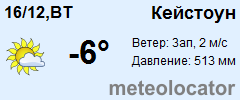 Прогноз погоды в Кейстоуне представляет собой результат всестороннего анализа прогностических данных. Кроме того, для учета микроклиматических особенностей погоды и климата города Кейстоун в алгоритме используются данные, поступающие с наземных станций. Все это делает возможным обновление и уточнение информации о погоде каждые 3 часа, так что Вы получаете самый свежий и достоверный прогноз погоды среди всех погодных сайтов.