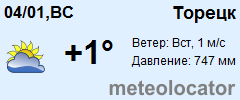 Представляем прогноз погоды в Торецке на 3 дня (сегодня, завтра и послезавтра). Подробнее...Щелкните на соответствующем дне, чтобы получить подробный прогноз по нему. Для просмотра расширенных данных щелкните по заголовку соответствующего блока из группы блоков, расплолженных ниже основного прогноза. Для получения данных на другие дни используйте стрелки слева и справа от таблицы или навигационное меню в левой колонке страницы. Свернуть
