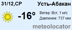 Представляем прогноз погоды в Усть-Абакане на 3 дня (сегодня, завтра и послезавтра). Подробнее...Щелкните на соответствующем дне, чтобы получить подробный прогноз по нему. Для просмотра расширенных данных щелкните по заголовку соответствующего блока из группы блоков, расплолженных ниже основного прогноза. Для получения данных на другие дни используйте стрелки слева и справа от таблицы или навигационное меню в левой колонке страницы. Свернуть