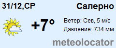 Представляем прогноз погоды в Салерно на 3 дня (сегодня, завтра и послезавтра). Подробнее...Щелкните на соответствующем дне, чтобы получить подробный прогноз по нему. Для просмотра расширенных данных щелкните по заголовку соответствующего блока из группы блоков, расплолженных ниже основного прогноза. Для получения данных на другие дни используйте стрелки слева и справа от таблицы или навигационное меню в левой колонке страницы. Свернуть