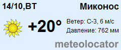 Представляем прогноз погоды в Миконосе на 3 дня (сегодня, завтра и послезавтра). Подробнее...Щелкните на соответствующем дне, чтобы получить подробный прогноз по нему. Для просмотра расширенных данных щелкните по заголовку соответствующего блока из группы блоков, расплолженных ниже основного прогноза. Для получения данных на другие дни используйте стрелки слева и справа от таблицы или навигационное меню в левой колонке страницы. Свернуть